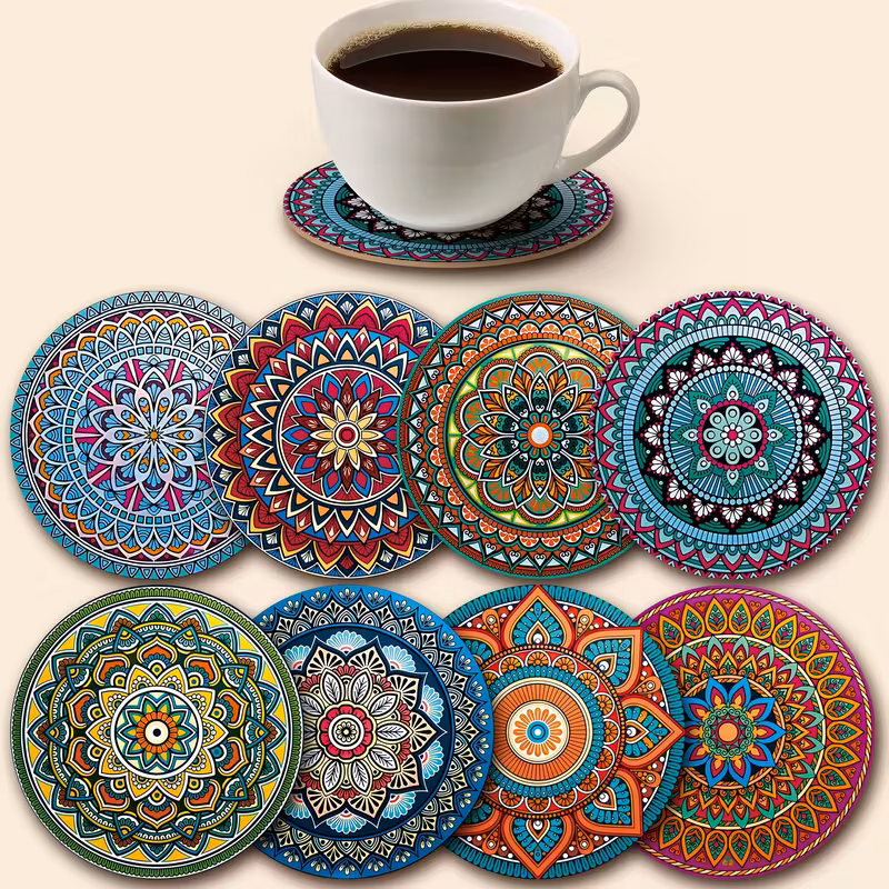Lot de 8 dessous de verre en bois mandalas, idéal pour les rassemblements festifs, bars, bureaux et foyers, taille 10 cm x 10 cm